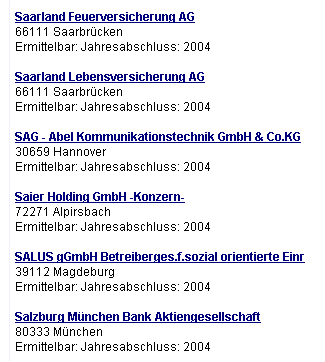 Classic Variante liefert: Kurzprofil mit den wesentlichen Grunddaten des Unternehmens: Firmenname, Adresse, PLZ + Ort, Namen der Geschäftsführer mit Anschrift, Namen der Gesellschafter/Anteile und Ortsangabe — > 15,- Euro