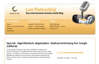 Gewohnterweise sind juristische Informationen immer ein wenig dröge und zumeist schwer verdauliche Kost. Nicht beim Law Podcasting. Hier sind alle Beiträge als Audio-Files auf dem Notebook oder via MP3 Player hörbar. Respekt muß man dem Autor bzw. Betreiber Rechtsanwalt Dr.Bahr ( http://www.dr-bahr.com ) bei der inhaltlichen aber auch visuellen Umsetzung zollen. Die Beiträge sind teilweise über 7 Minuten (Vorlesezeit) lang und umfassen damit recht viel Information. Diesen Umfang einmal pro Woche auf die Beine oder besser in das Web zu stellen – Hut ab! Für die Fachsegmente „Neue Medien“ und Glücks- und Gewinnspiele“ liegen bereits zahlreiche Beiträge vor.