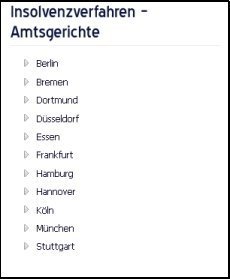 Weitere Städte sind bereits in der Bearbeitung. Neben den Top 10 deutschen Städten: Berlin, Bremen, Dortmund, Düsseldorf, Essen, Frankfurt, Hamburg, Hannover, Köln, München und Stuttgart sind bereits die ersten weiteren Insolvenzgerichte eingebunden worden.