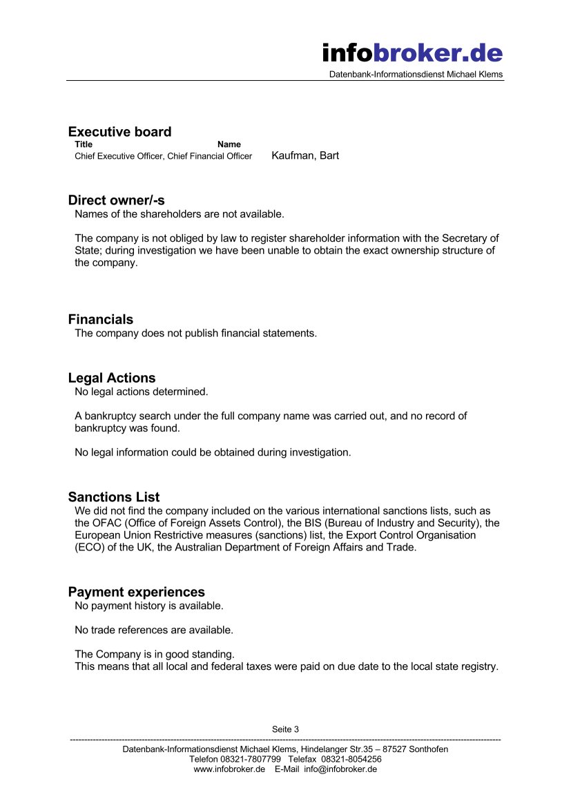 Recherche und Lieferung einer Firmenauskunft USA durch einen lokalen U.S. Partner. Die Auskunft wird per E-Mail als PDF-Datei zugestellt.